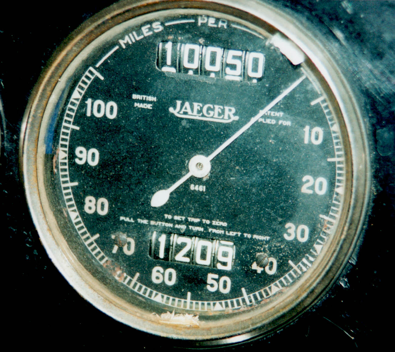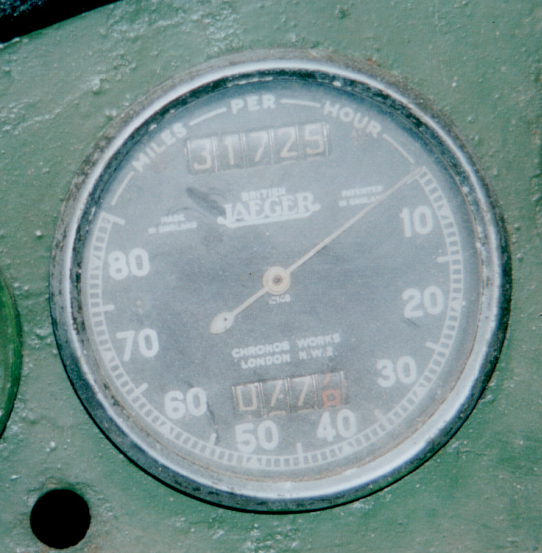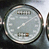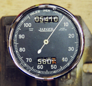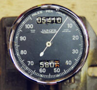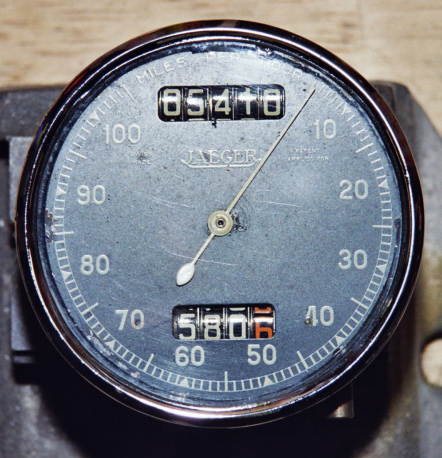 The original speedometer was an 80mm Jaeger chronometric instrument, reading to 100 mph. (The 80mm refers to the diameter of the case, or the hole it fits into.) There are various Jaegers that look vaguely similar but are incorrect, in particular the ones with magnetic mechanisms, which have the zero at bottom left, the 5-digit odometer below the needle and the cable drive in the centre of the rear case. Chronometrics have the drive off-centre. 100mph chronometric speedos are rare but 80mph chronometrics are readily available and can be recalibrated and fitted with replica 100mph dials.