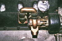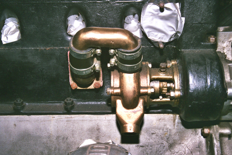 The original water pump was a two-part assembly comprising (i) a cast bronze mounting bracket bolted onto the timing chest and containing the main rotary seal, and (ii) a cast aluminium pump body that encloses the rotor and incorporates the outlet passage that bolts onto the cylinder block.